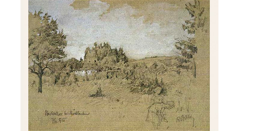 Zahlreiche Photographien zeigen den Burghügel mit der Ruine inmitten der Landschaft oder Motive der verfallenden, überwucherten Mauern.