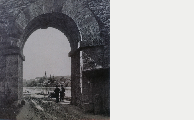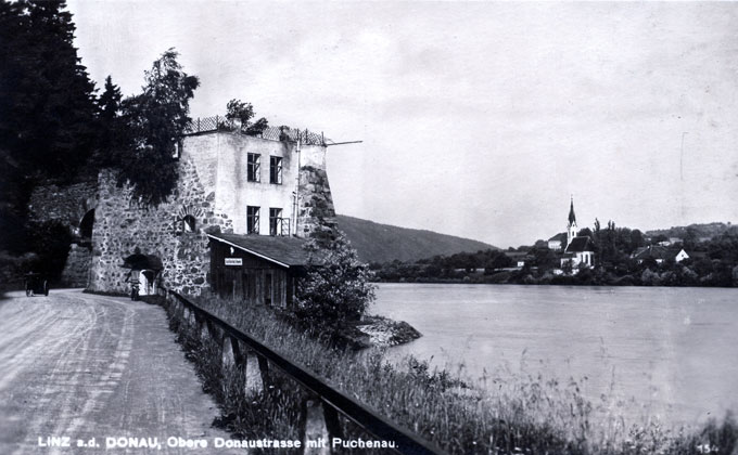 Torbogen (Verbindung zwischen Anschlussmauer und Klause Adelgunde) mit Blick auf Puchenau, ca. 1930.